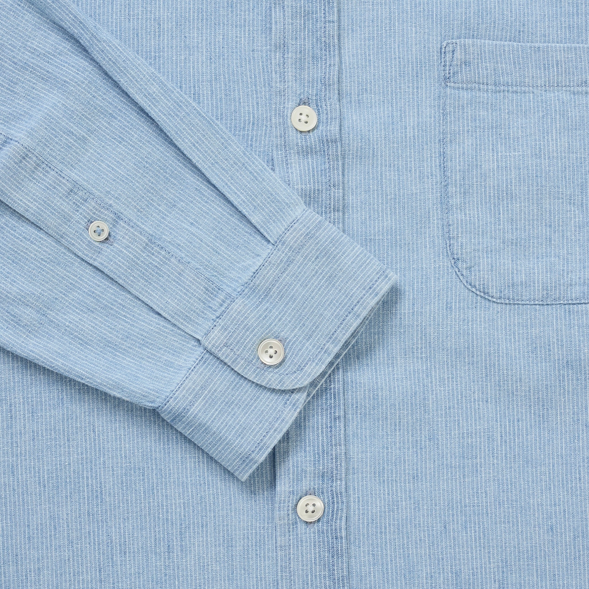 Our classic collarless shirt in a cotton/linen blend denim, finished in a light washed blue and white stripe. An easygoing shirt that will be a favourite to wear all-year-round.